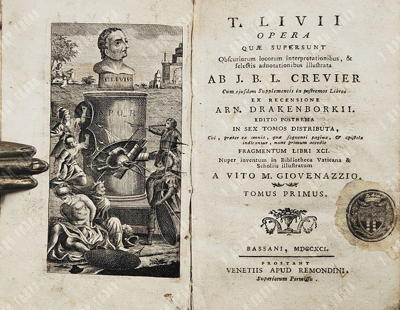 1. T. Livii Opera, quæ supersunt, obscuriorum locorum interpretationibus, & selectis adnotationibus illustrate ab J. B. L. Crevier. Cum ejusdem supplementis in postremos libros ex recensione Arn. Drakenborkii. Tomus primus. / Сохранившиеся труды Тита Ливия, снабжённые толкованиями малопонятных мест и избранными примечаниями Ж-Б. Л. Кревье. С теми же дополнениями в последних книгах по редакции Арн. Дракенборха — Bassani: Prostant Venetiis apud Remondini, 1791.