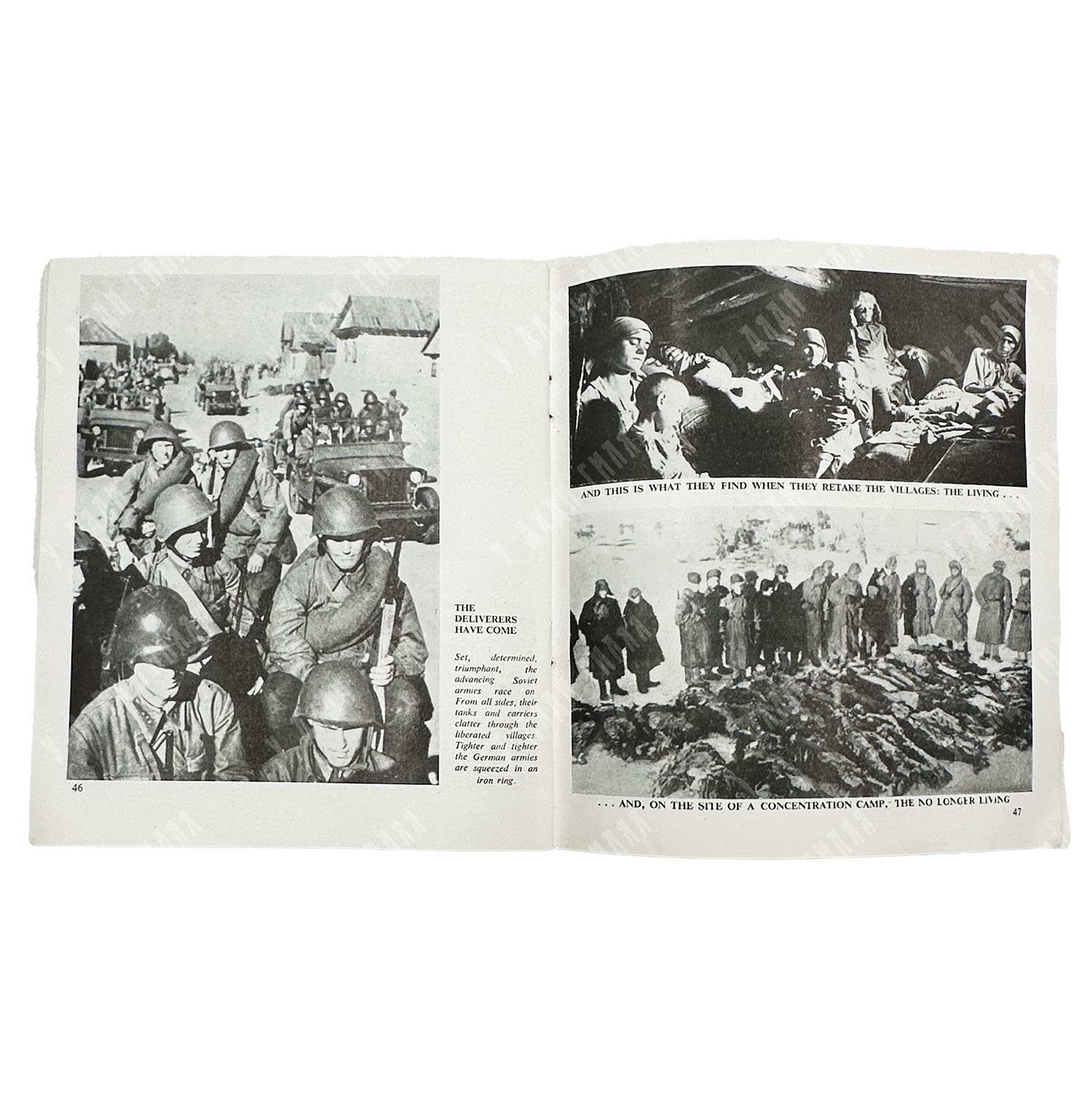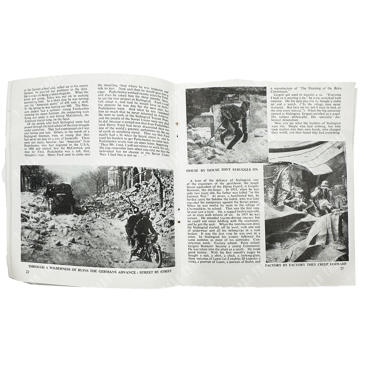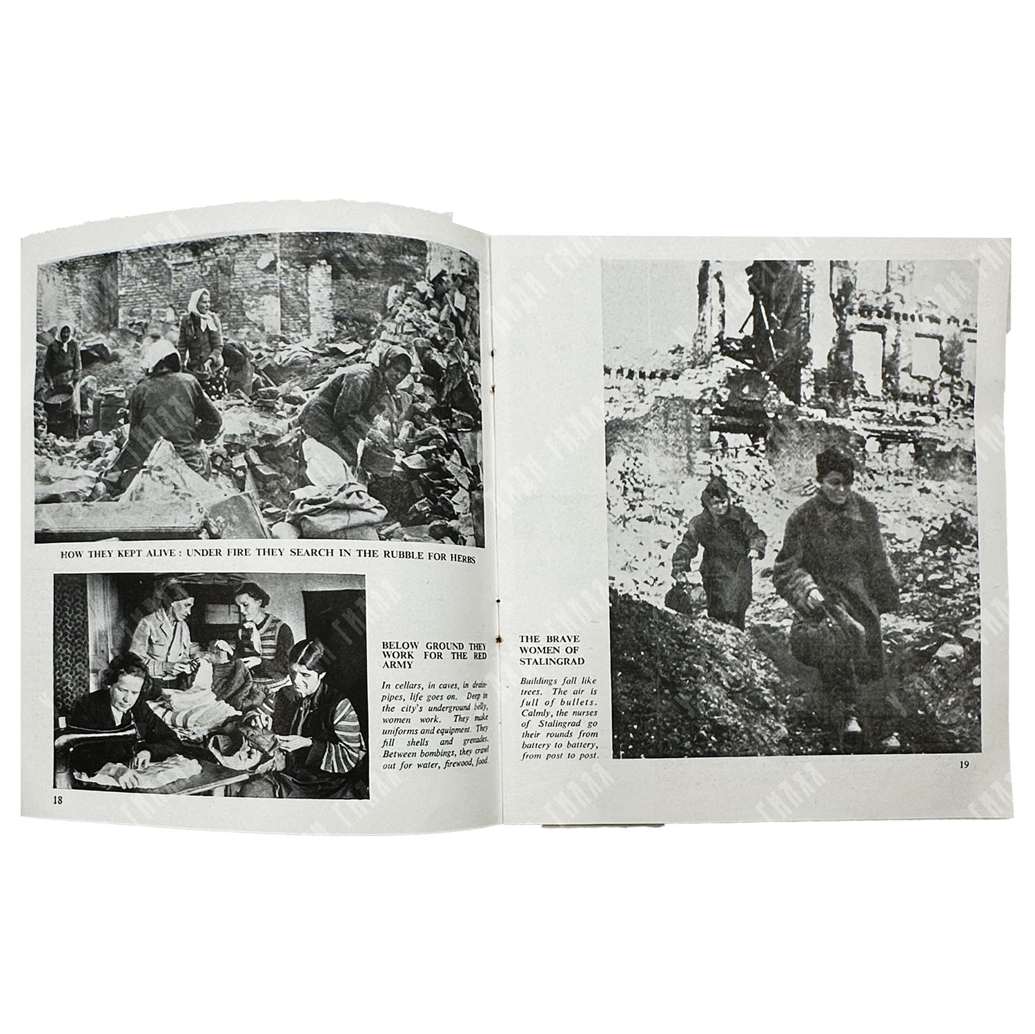Редкое зарубежное пропагандистское издание времен Второй мировой войны, выпущенное по «горячим следам» Сталинградской битвы. Книга представляет собой уникальный пример того, как подвиг советского народа транслировался западной аудитории союзников. На 52 страницах разворачивается масштабная визуальная хроника: от драматичных видов руинированного города до портретов солдат в моменты наивысшего напряжения боев. Особую ценность представляют оперативные карты наступлений и редкие снимки работы в тылу, призванные подчеркнуть тотальный характер войны. Издание является важным историческим источником, отражающим международную солидарность и роль британской компартии в поддержке Восточного фронта.