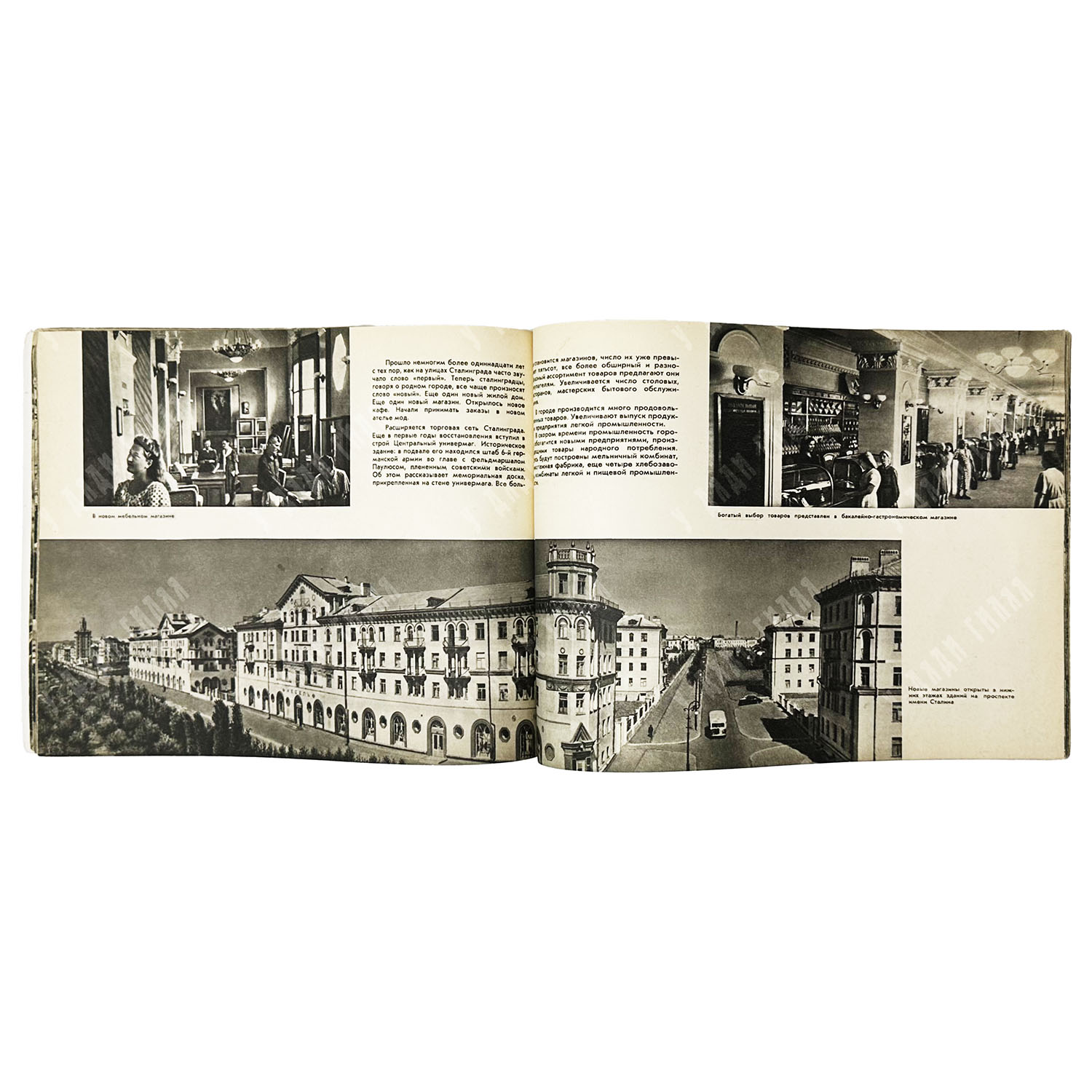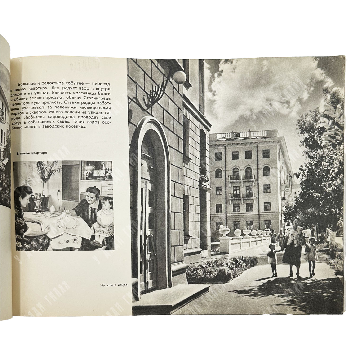 Уникальное фотодокументальное свидетельство возрождения города-героя из руин. Альбом издан к десятилетию начала масштабного восстановления Сталинграда и представляет собой визуальный отчет о превращении выжженной земли в триумф сталинского ампира. Исключительность издания заключается в личности фотографа: Георгий Зельма, классик советского фоторепортажа, прошел всю Сталинградскую битву с камерой в руках. В данном альбоме он выступает не только как фиксатор строек и заводов, но и как мастер психологического портрета, запечатлевший энтузиазм строителей. Панорамные снимки новых проспектов и площадей соседствуют с кадрами разбора завалов, создавая мощный контраст между прошлым и настоящим города.